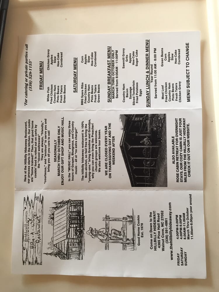 Welcome to Hillbilly Hideaway Restaurant, a charming eatery nestled in Walnut Cove, North Carolina. Known for its inviting family-style dining, this cozy log cabin venue serves up an all-you-can-eat feast that celebrates hearty Southern cuisine. Signature dishes include crisp fried chicken, savory country ham, and delightful flapjack biscuits, all accompanied by a variety of comforting sides like creamy pinto beans and fresh coleslaw.